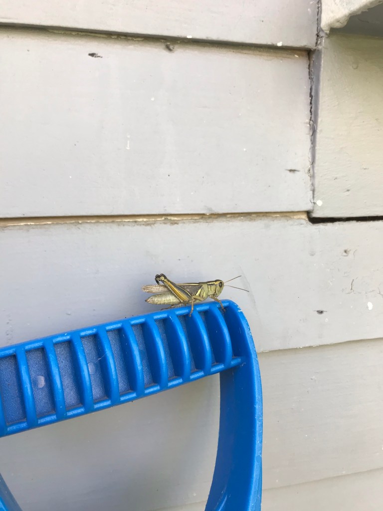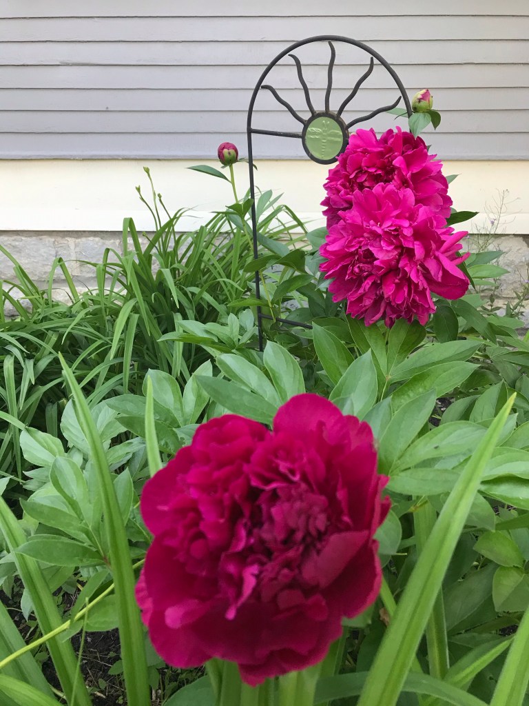 Last fall I’d had plans to turn over the wilderness, previously a vegetable garden, replant it and see a harvest, and it didn’t happen. Instead there’s an enormous grasshopper sitting on the handle of a shovel by the garage; last week I saw its friend meditating on the long grass by the rhubarb. (Even in wilderness, the rhubarb still thrives.) What I thought was a rosebush is maybe a variety of apple tree, with a steadily thickening trunk and no sign of blooms. The apple tree I expected nothing from this year has clusters of ripening apples on a few branches. Nothing is growing quite as I expected, except the peonies: overgrown, flopping under the weight of their blooms, nevertheless flaunting them in the sunshine.